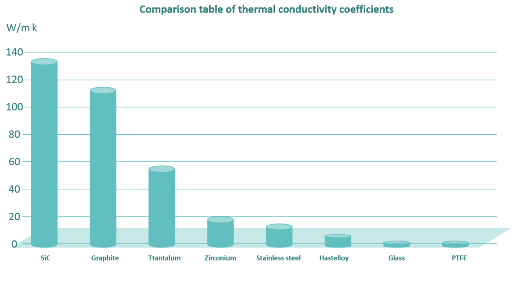 Silicon carbide ceramics excel in this regard as a superior material. They offer outstanding thermal conductivity, exceptional high-temperature strength, excellent resistance to oxidation and thermal shock, a long lifespan, low maintenance requirements, and reliable and stable performance. Left is a comparison of the thermal conductivity coefficients of several materials, highlighting how silicon carbide’s high thermal conductivity significantly enhances the efficiency of heat exchangers.